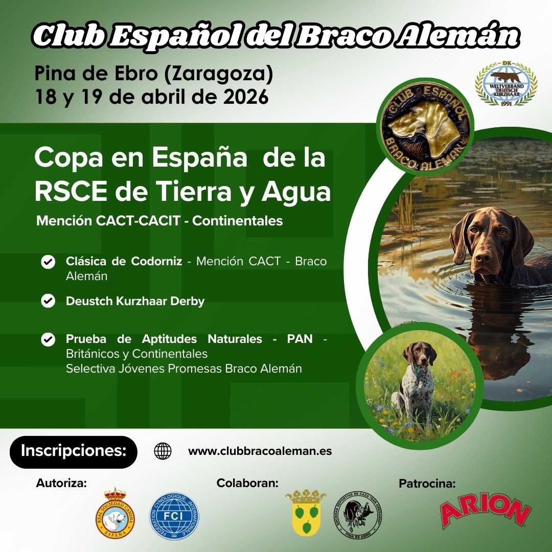 La localidad zaragozana de Pina de Ebro se convertirá, los próximos 18 y 19 de abril de 2026, en el epicentro técnico de la muestra en España. El Club Español del Braco Alemán (CEBA) ha anunciado un programa de pruebas de altísimo nivel que promete reunir a los mejores ejemplares y conductores de la raza, bajo la autorización de la Real Sociedad Canina de España (RSCE) y la FCI.