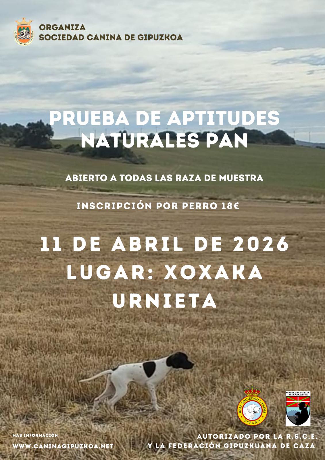 La Sociedad Canina de Gipuzkoa (Gipuzkoako Txakur Elkartea) ha anunciado la celebración de una nueva Prueba de Aptitudes Naturales (PAN), que tendrá lugar el próximo 11 de abril de 2026. El escenario elegido para esta jornada de campo será el paraje de Xoxaka, en la localidad de Urnieta, un entorno ideal para evaluar las cualidades innatas de los perros de caza.
